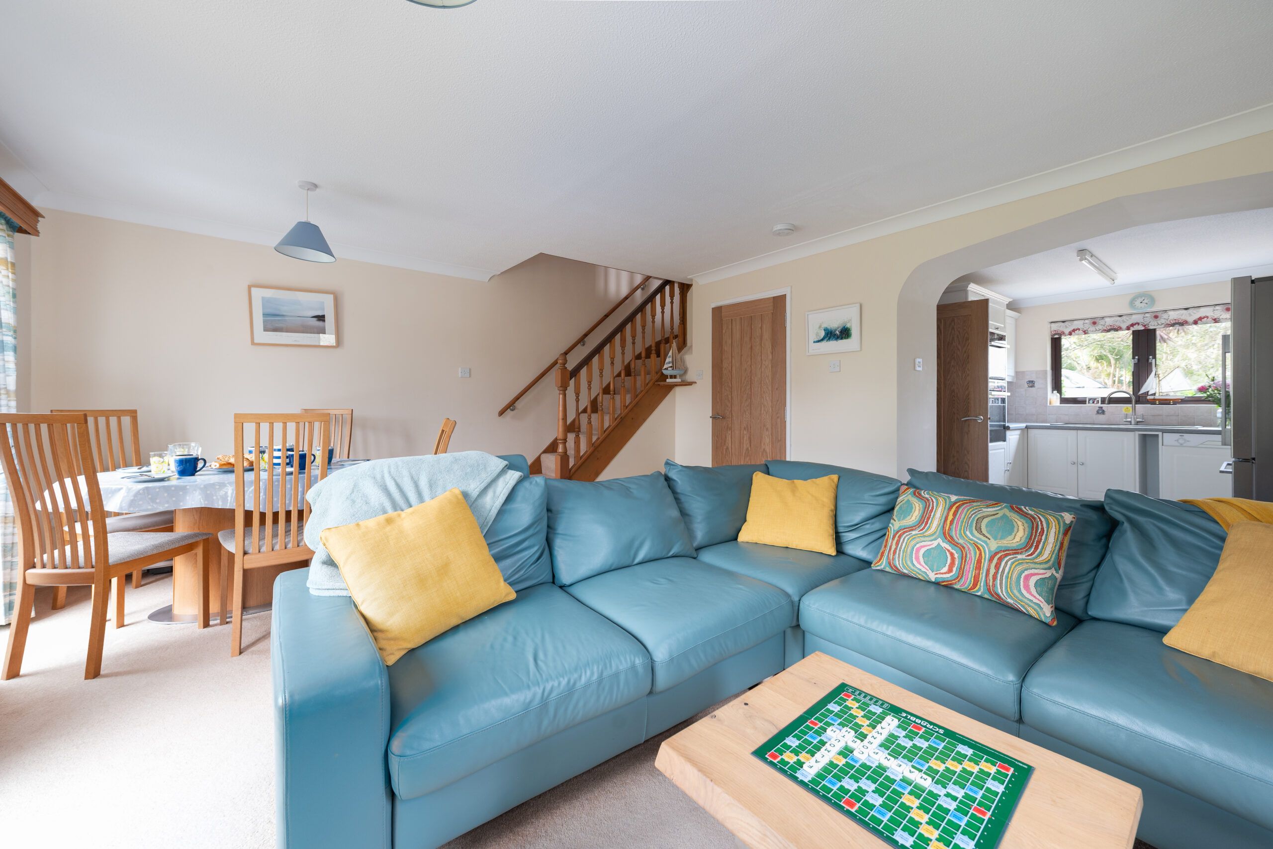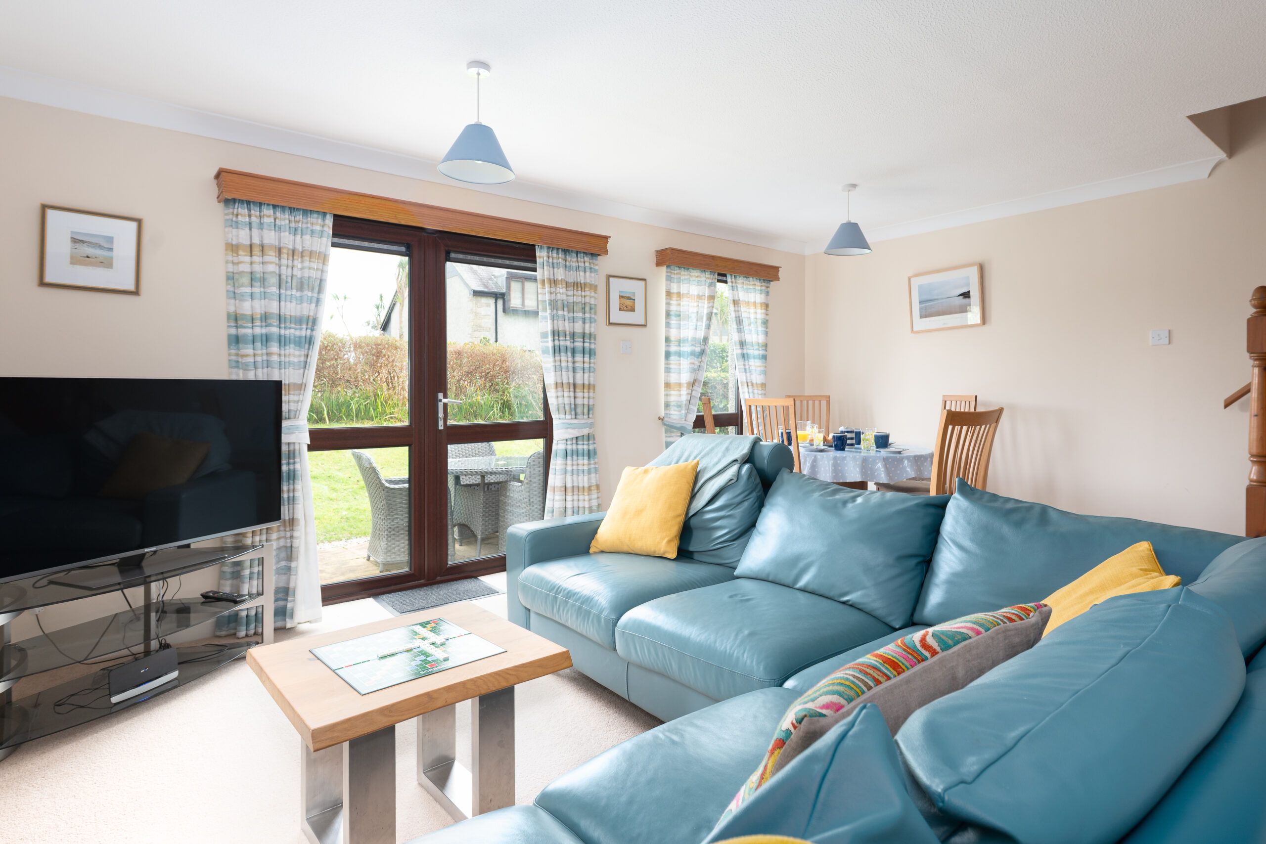A dedicated parking space sits conveniently right outside the front door. Stepping inside, the entrance hall opens to the light and spacious open-plan living area, thoughtfully designed for comfort and togetherness. The sitting area is furnished with a large sofa facing towards the private patio and greenery beyond, creating a perfect setting for unwinding after a day on the beach. A Smart TV offers access to Netflix, Freeview, YouTube, and iPlayer.