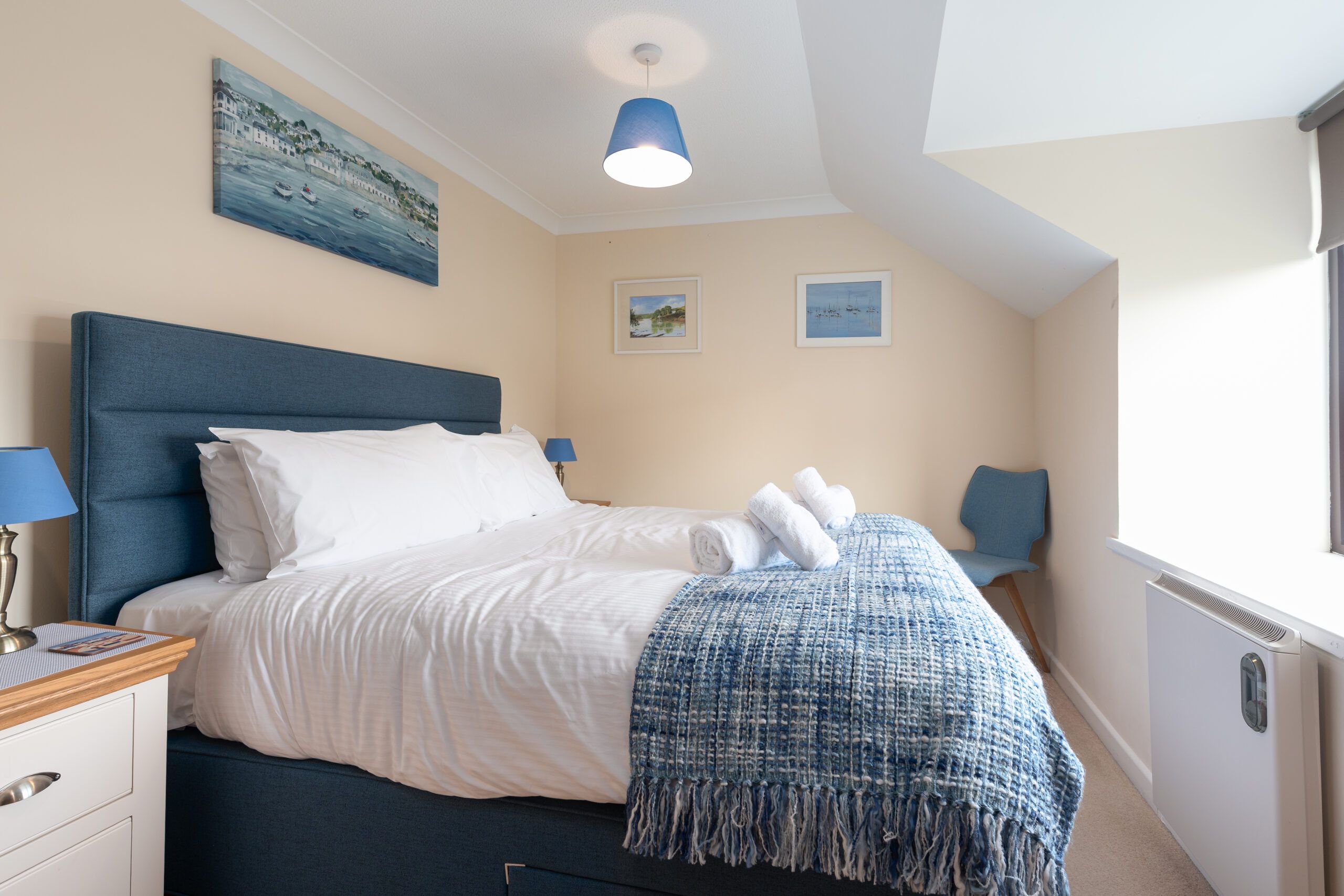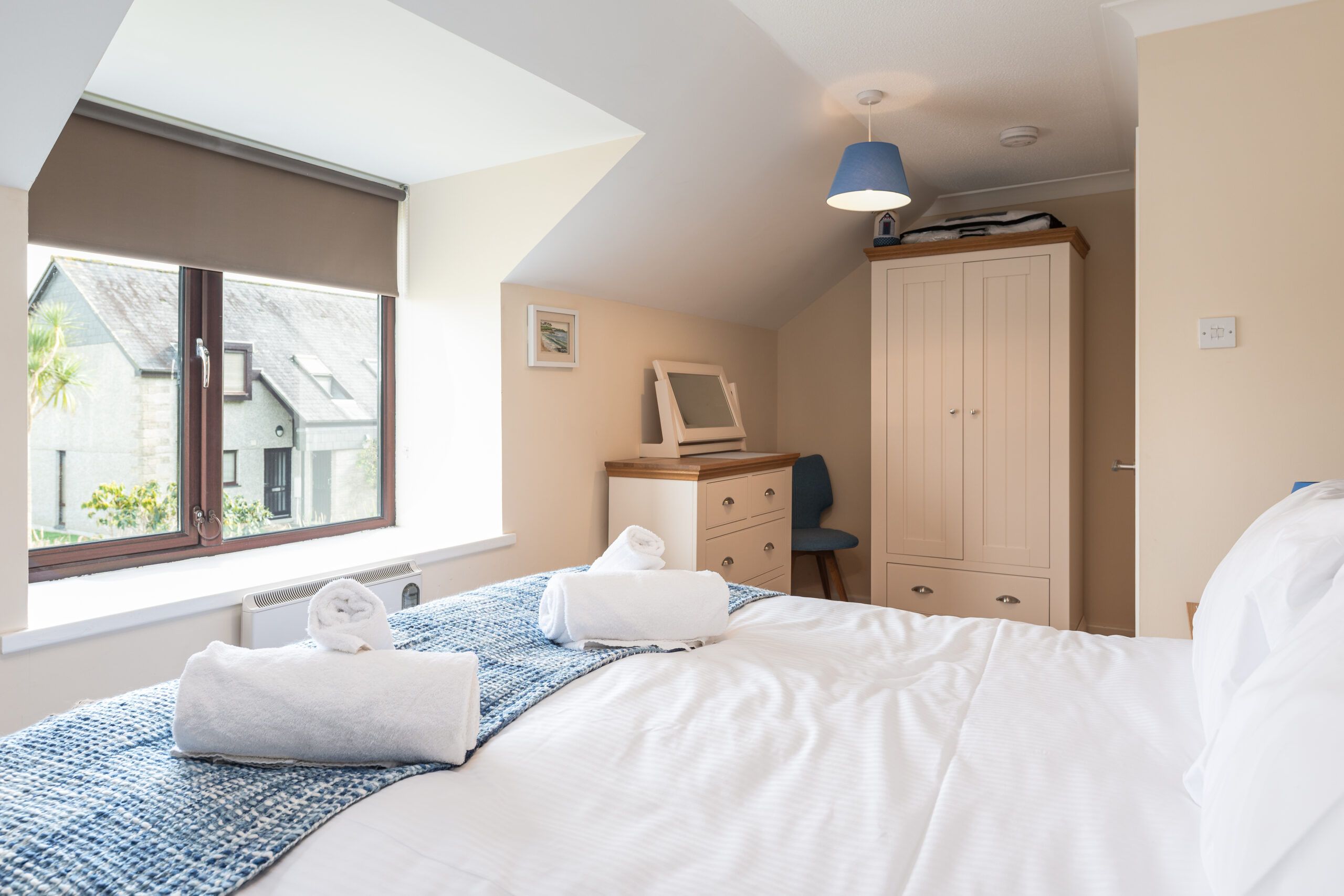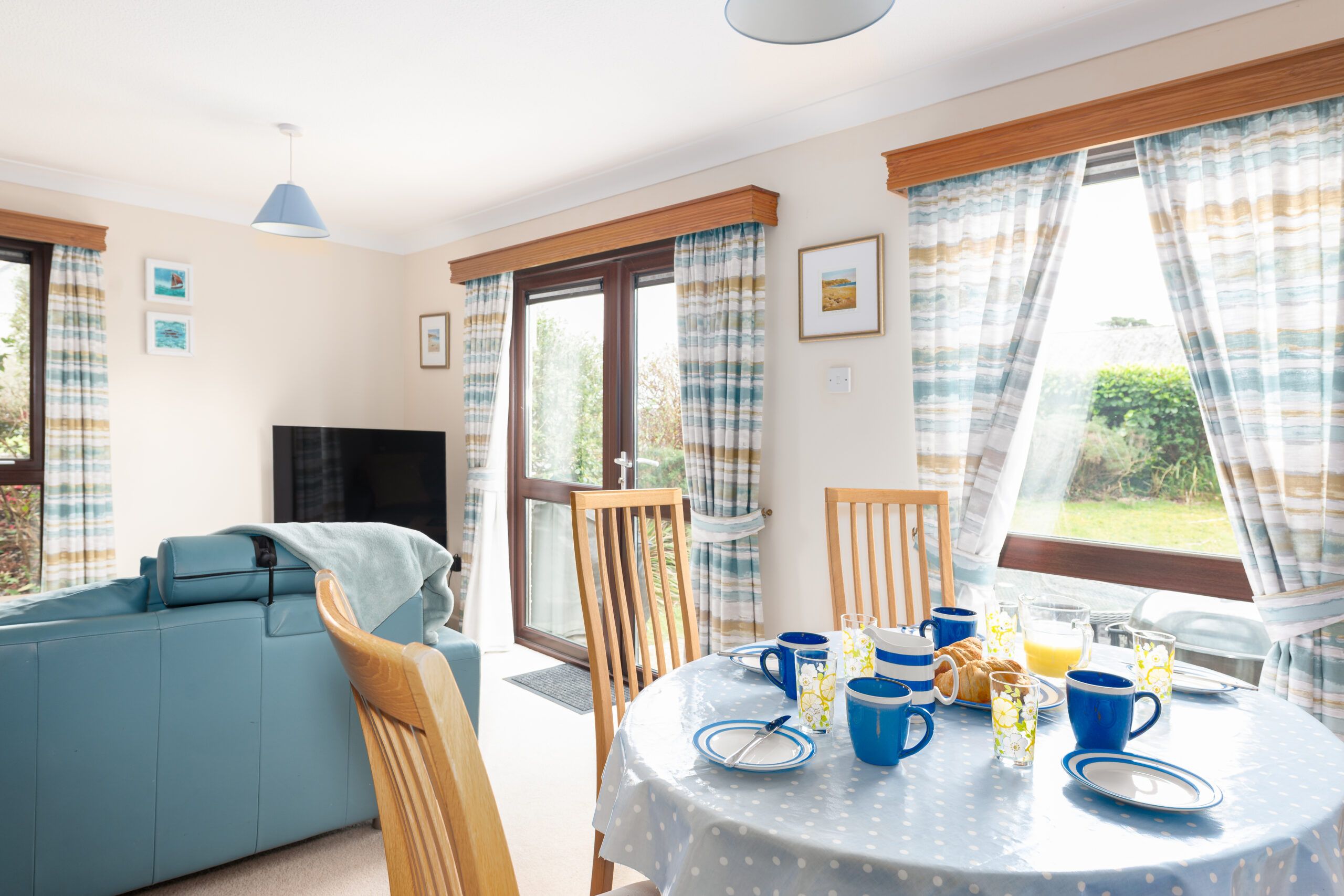 The full-size dining table comfortably seats the whole family and sits adjacent to the modern, fully equipped kitchen. With integrated appliances, generous storage, and a complete inventory of kitchenware, preparing meals here is a pleasure. From the dining area, doors open to the patio area with communal lawns, which provides an inviting space to relax in and enjoy casual meals at the smaller table offering peaceful views of the surrounding greenery. The private patio outside is perfect for al fresco dining or simply enjoying the Cornish sunshine.