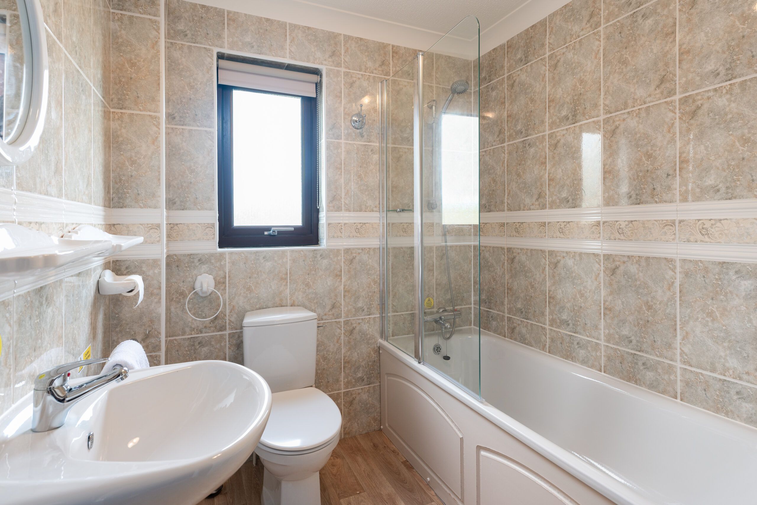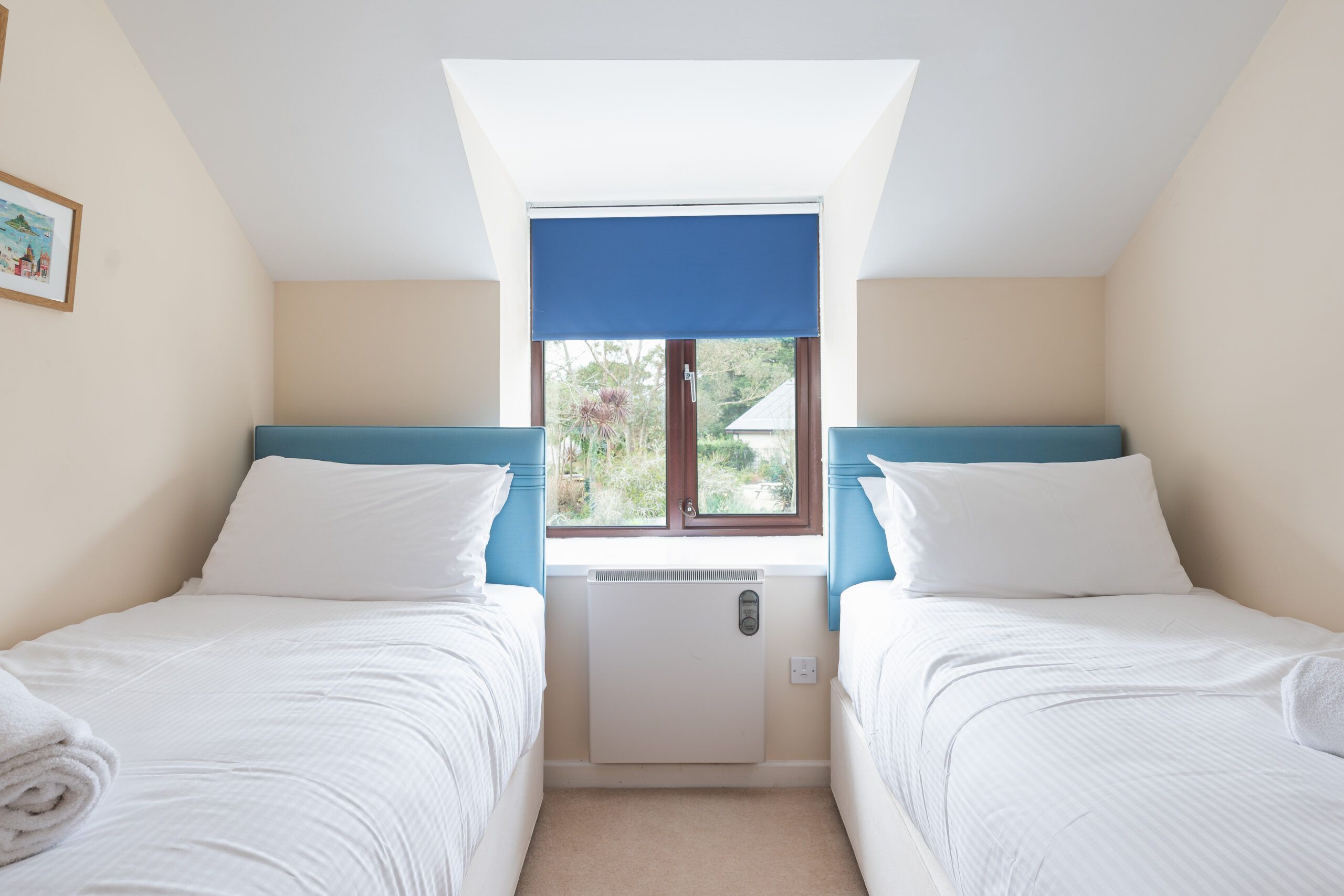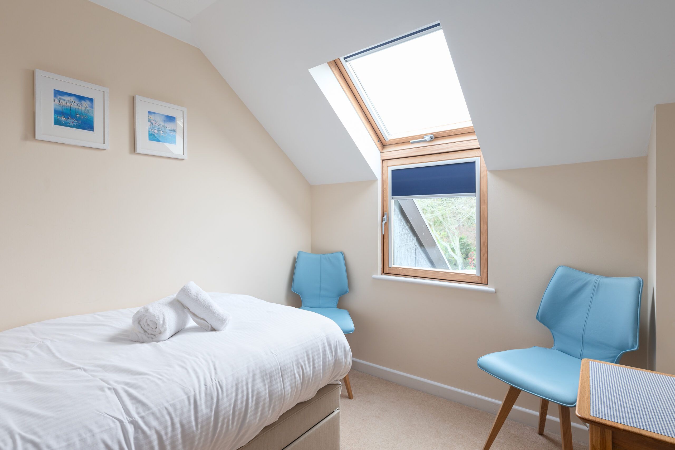 A full flight of stairs leads up to the three bedrooms and family bathroom. The master bedroom features a super king-size bed and enjoys views across the woodland, while the twin bedroom and single room are bright, restful spaces perfect for both adults and children. The family bathroom includes a bath with fitted shower, WC, and basin.