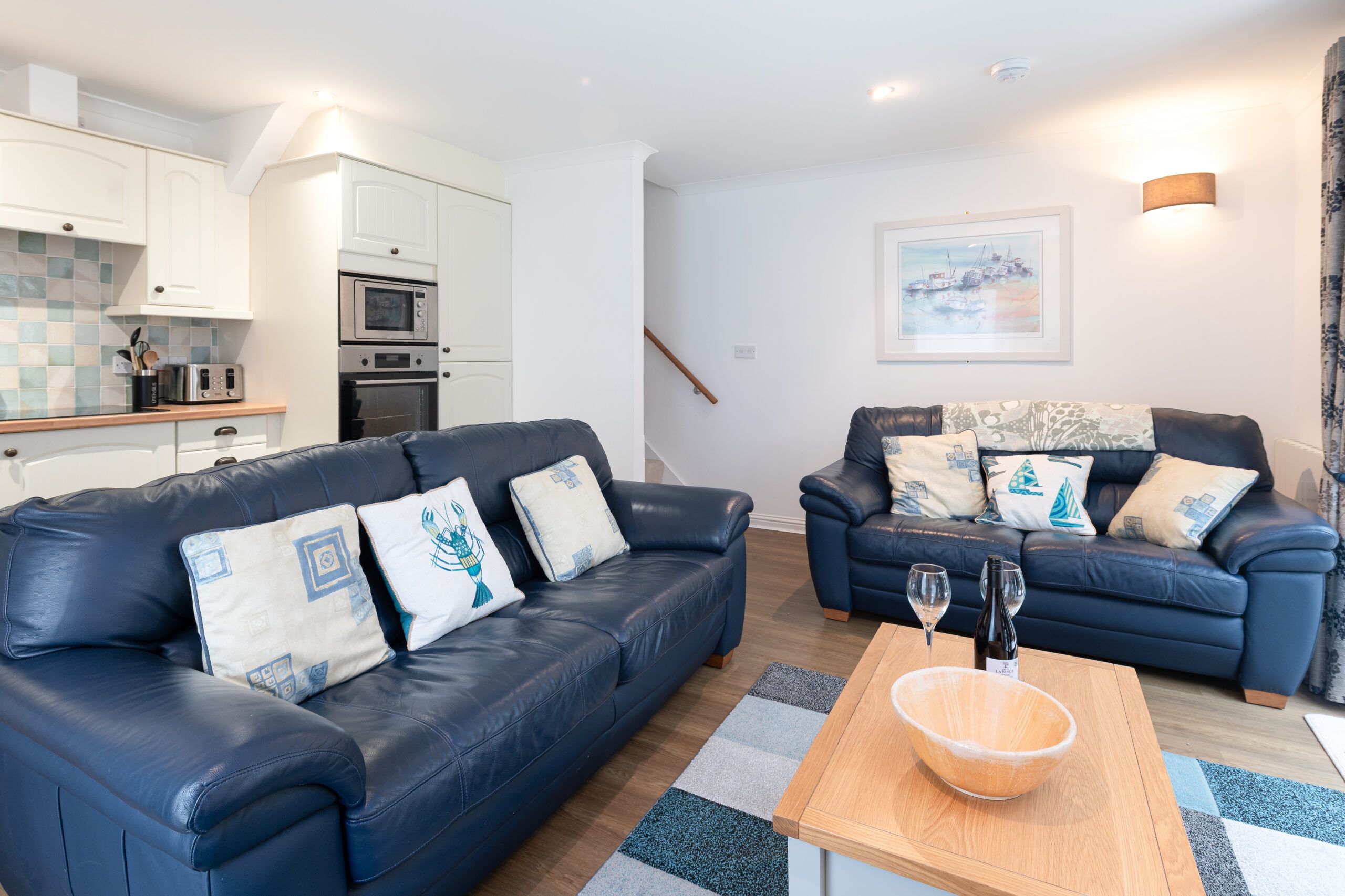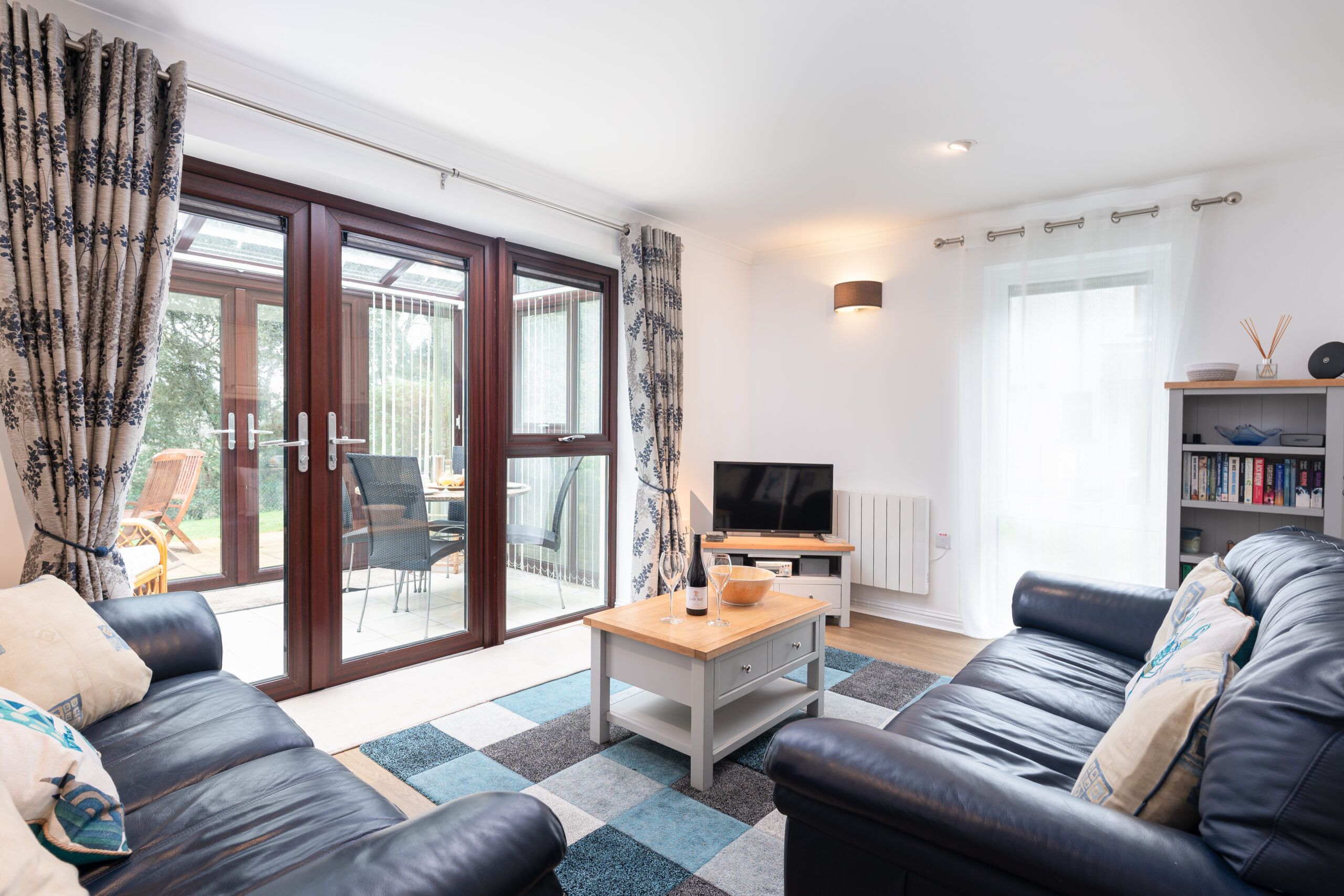 Stairs lead down from the entrance hallway to the welcoming open-plan living area, where a pair of comfortable sofas create a relaxed sitting space overlooking the conservatory and garden area beyond. A Smart TV provides access to Netflix, Freeview, YouTube and iPlayer, and there is free Wi-Fi throughout. A DVD player is also provided with Bluetooth speaker, stereo and Nintendo Wii console with a variety of games. The space is bright and airy, with modern décor and thoughtful touches that make it easy to unwind and feel at home.