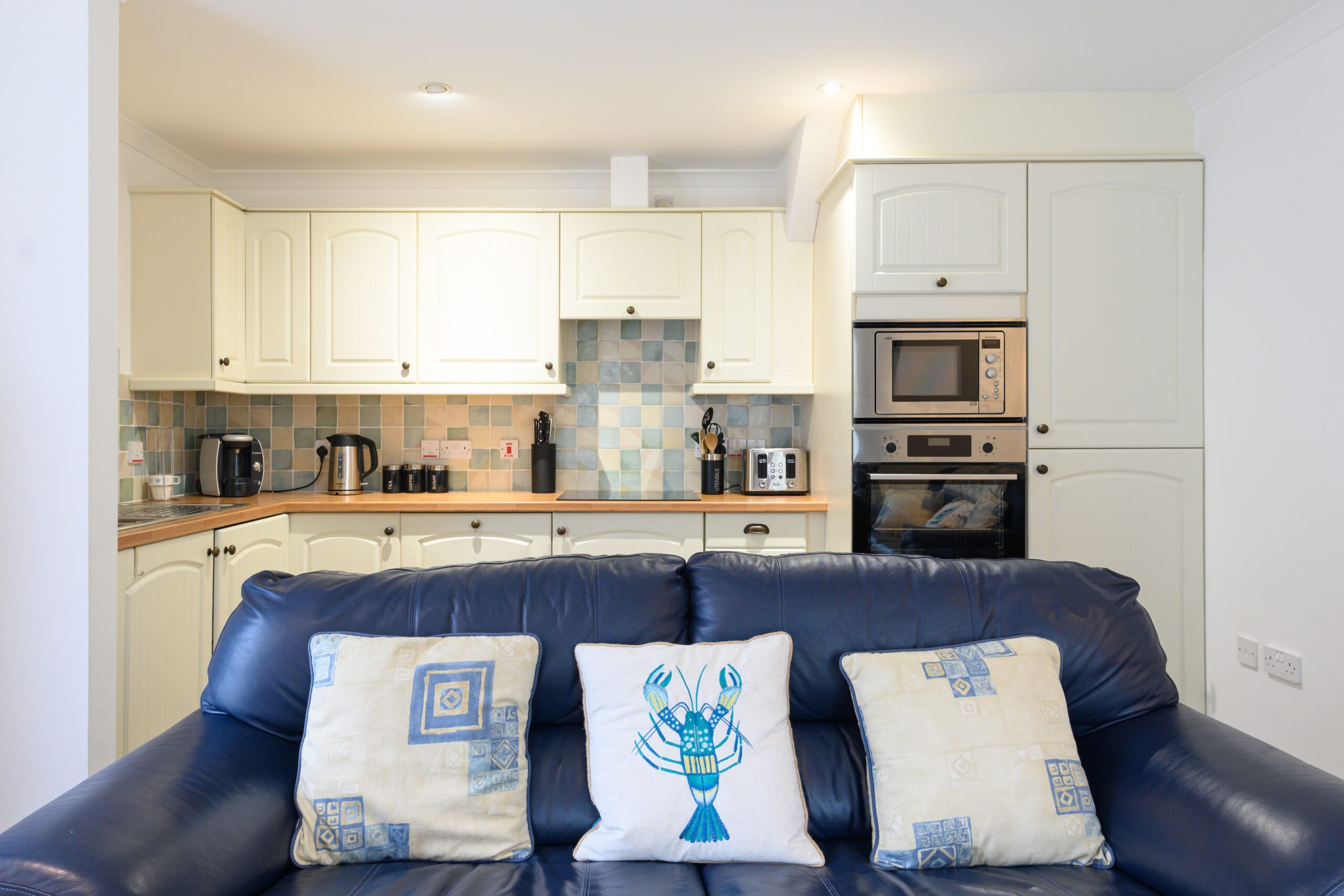 Adjacent to the sitting area, the fully equipped kitchen has everything required for easy holiday catering, including an electric hob and oven, microwave, fridge/freezer, washing machine/dryer and dishwasher. The granite worktops and light modern finish make this a delightful and practical space for cooking.