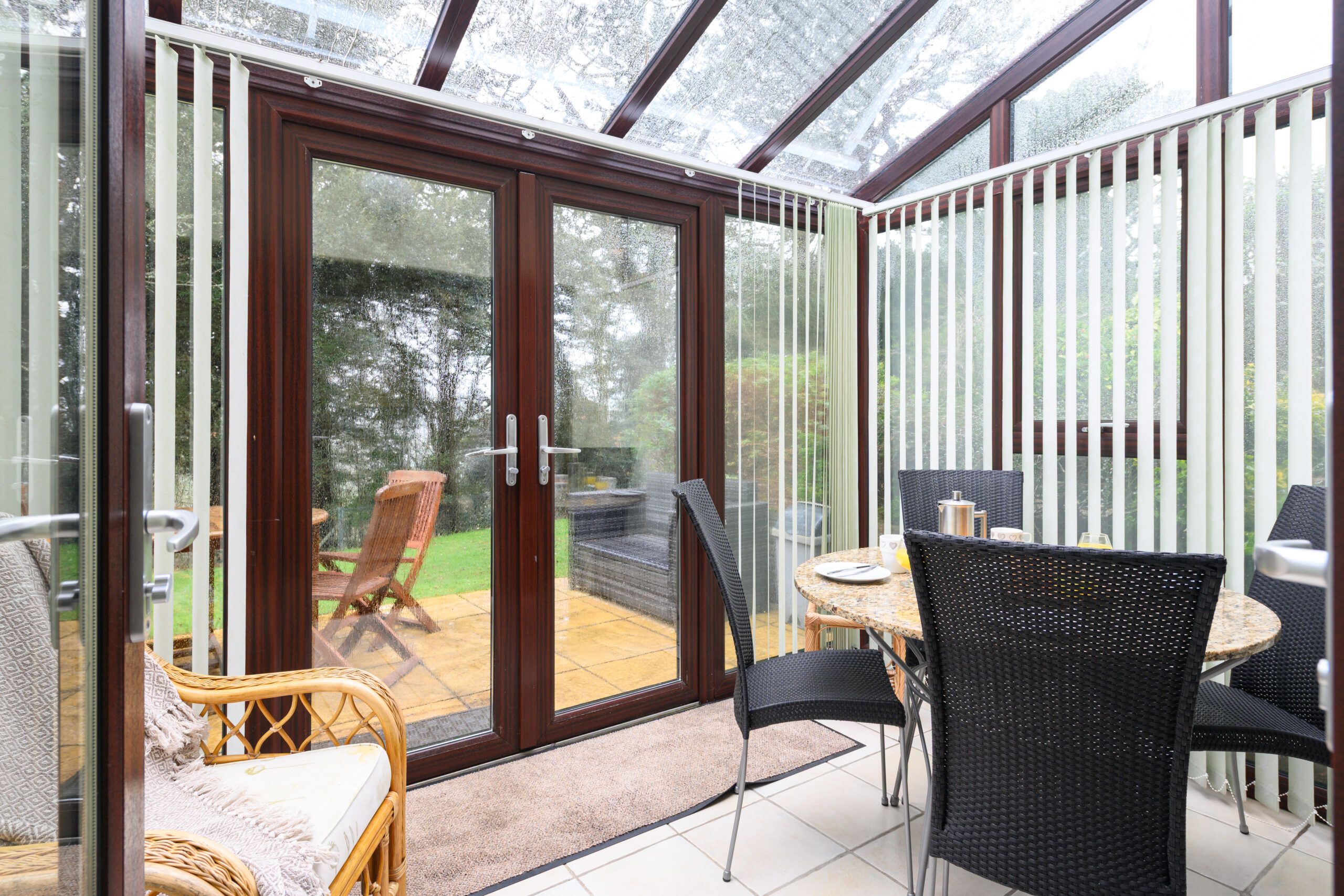 The conservatory extends the living area beautifully, offering a lovely spot for morning coffee or evening drinks. Patio doors open directly onto the terrace, where guests can enjoy the fresh sea air and views of the surrounding gardens.