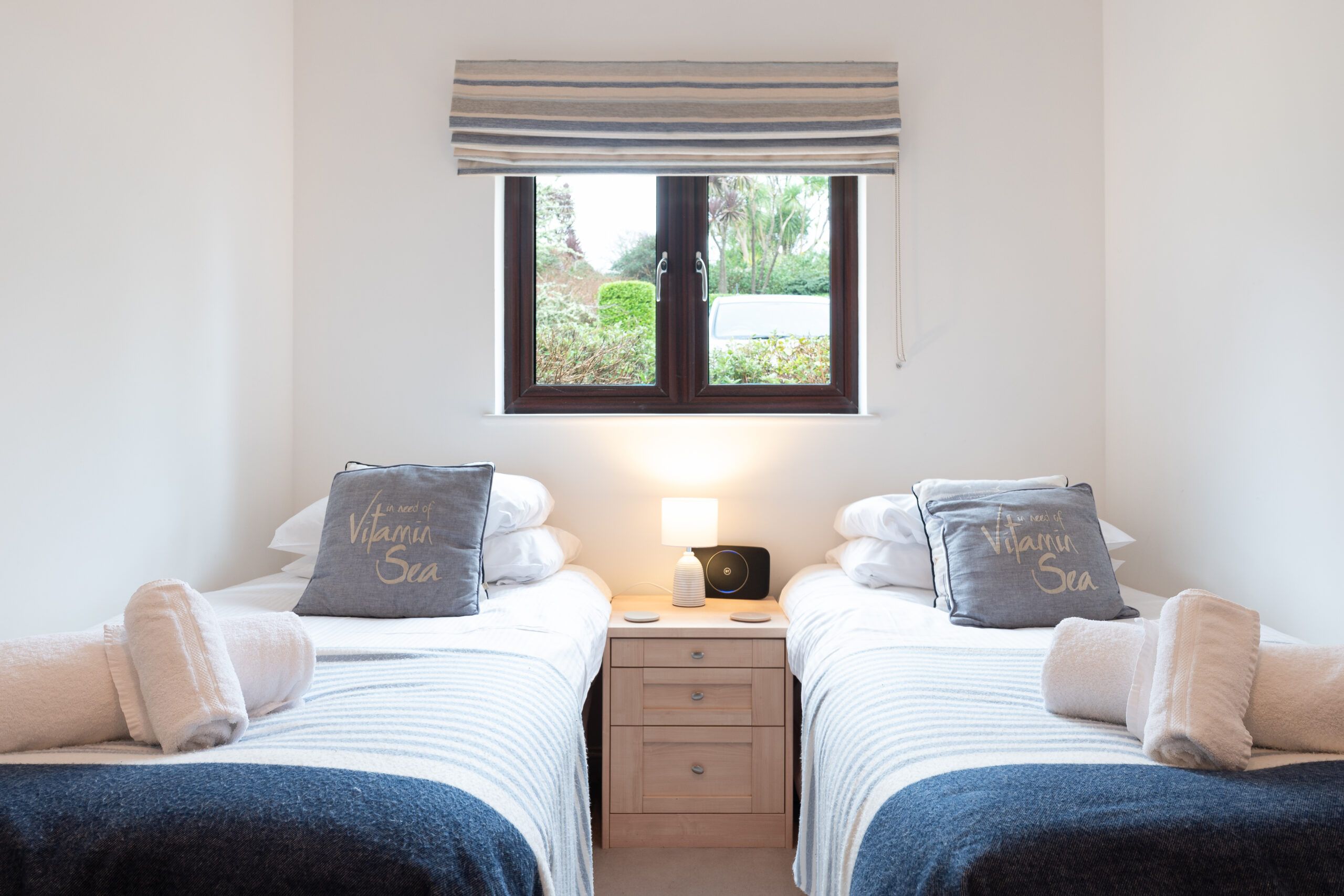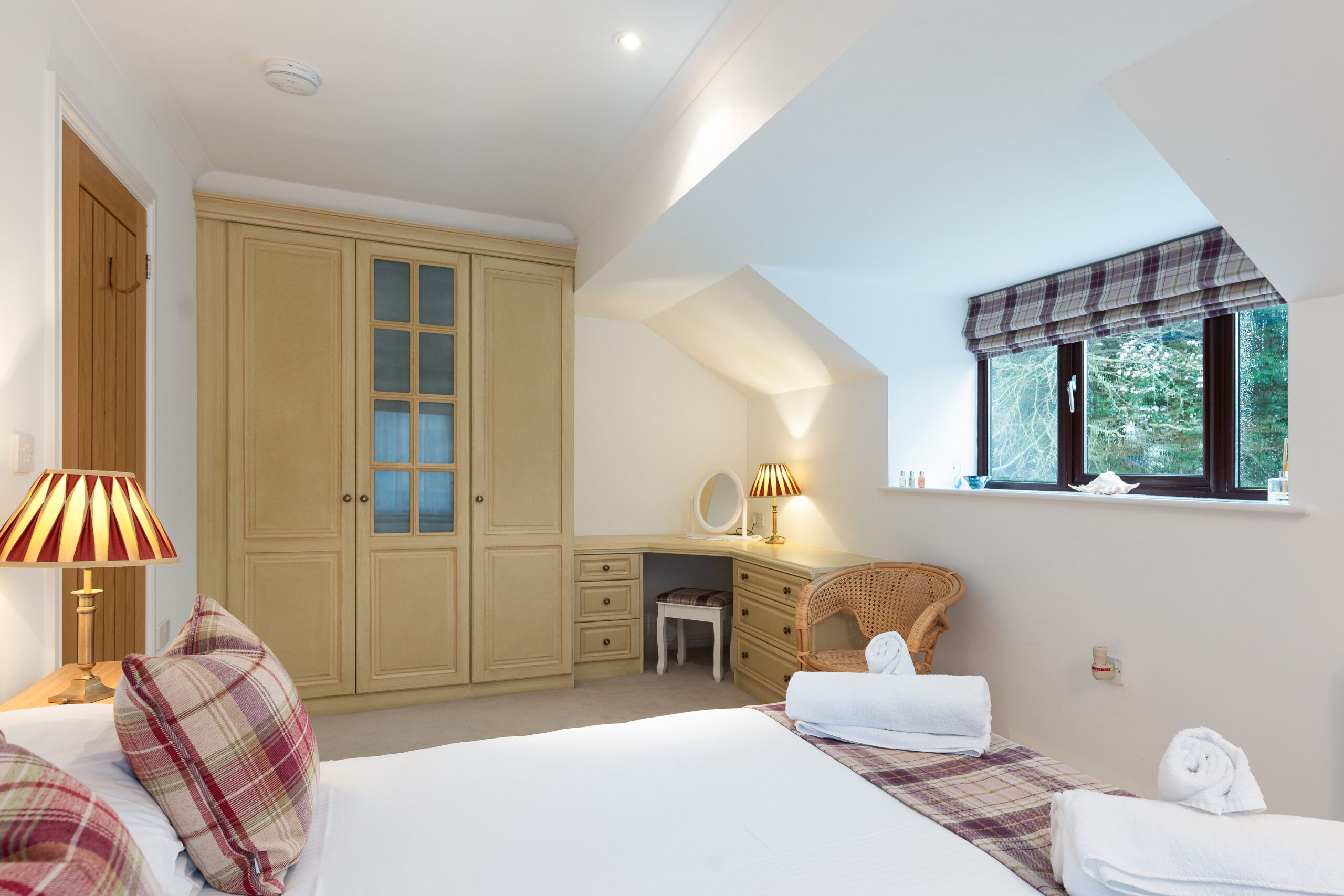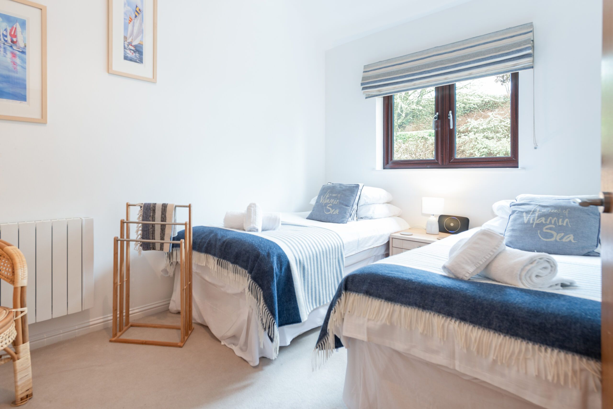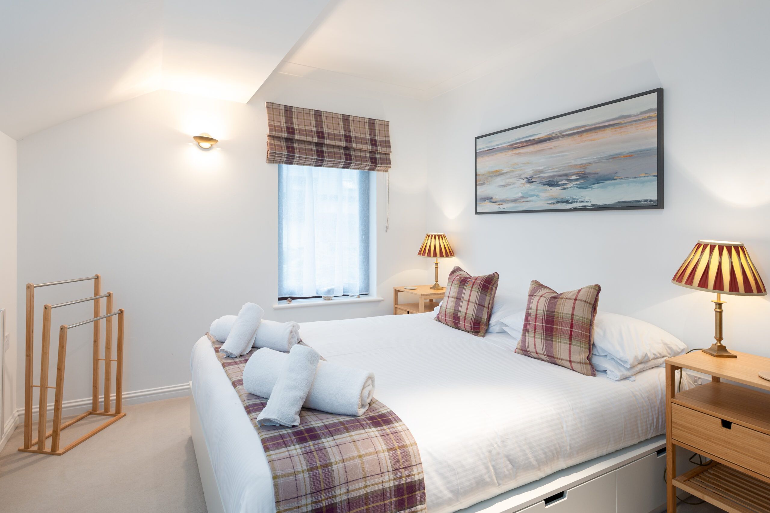 Both bedrooms are comfortably furnished with quality linens and a calm, restful feel. The downstairs WC and separate shower room are bright and modern, with a heated towel rail.